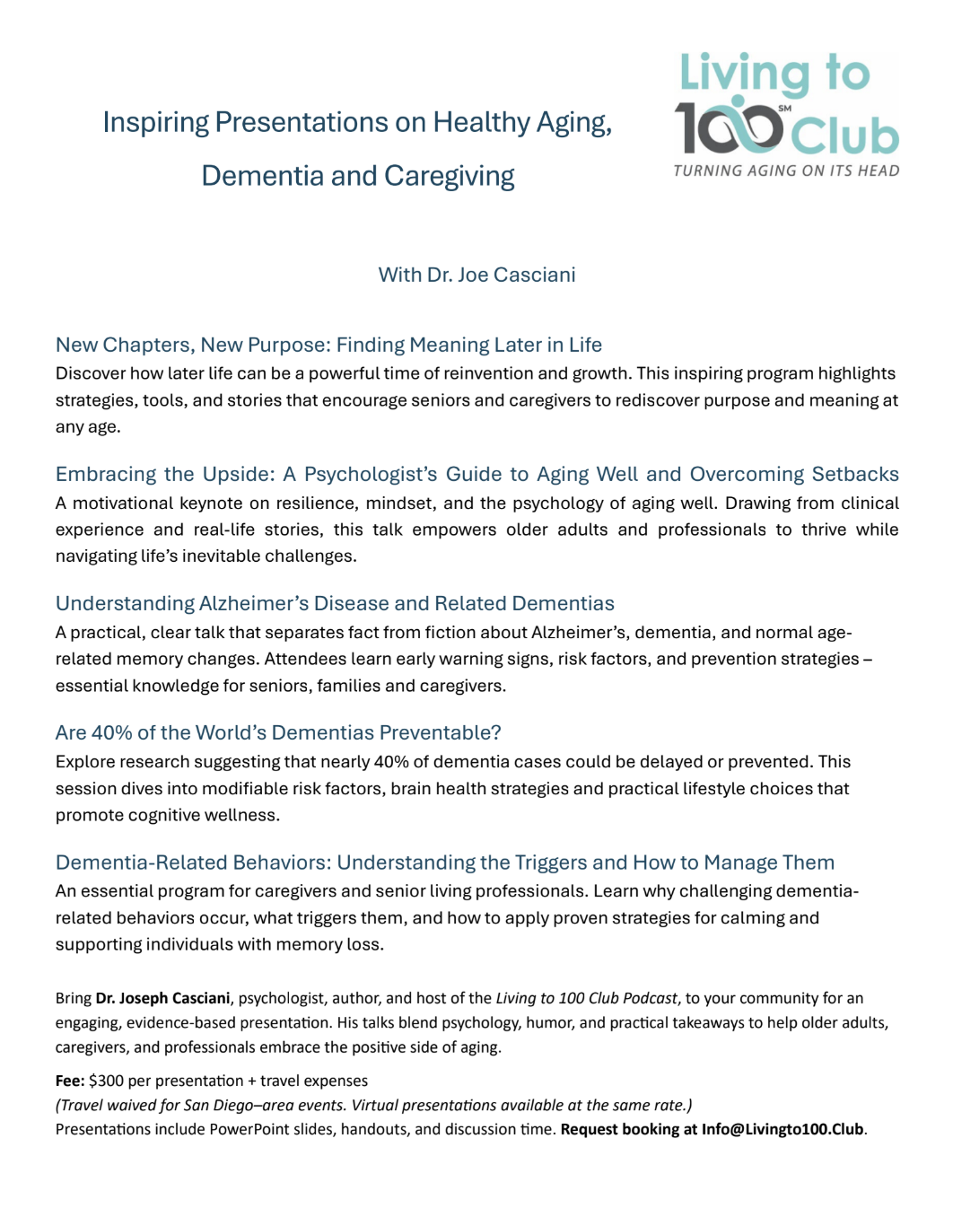 Every stage of life has its challenges but also its potential for growth, meaning, and joy. Dr. Joe Casciani, geropsychologist, author, and founder of the Living to 100 Club, brings that truth to life through his engaging and deep presentations on healthy aging, dementia, and caregiving.